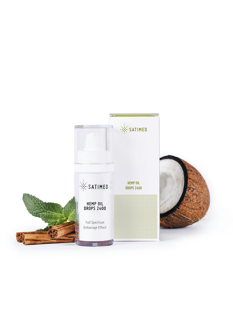 SATIMEDTM HEMP OIL DROPS 2400 is based on SATIMEDTM PLUS FORMULA, that comprises the essential combination of herbal compounds from the Hemp, Cinnamon and Mint plants, formulated in Hemp Seed Oil and natural MCT oil. Cinnamon and Mint provide a pleasant and smooth taste